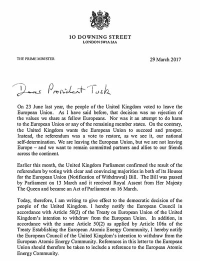 据悉,这份六页纸的分手信被连夜送到英国驻欧盟大使巴罗手上,由他担任正在29日正式将其递交给欧盟理事会从席图斯克。而正在28日当晚,文翠珊已别离礼貌性致电给图斯克、总理默克尔、法国总统奥朗德、欧盟委员会从席容克等人,通知英国启动脱欧事宜。