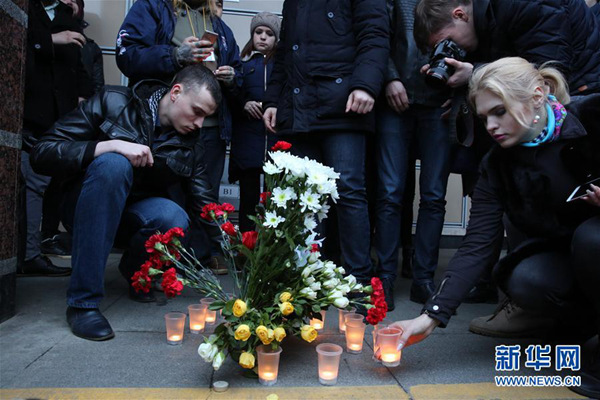 4月3日,正在俄罗斯,悼念地铁爆炸事务遇难者。