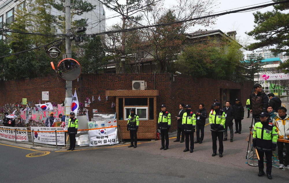 图:韩国27日正在朴槿惠位于首尔的私宅外执勤 法新社
