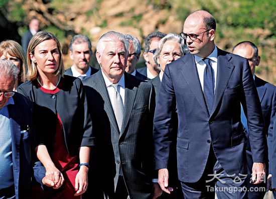 美国务卿蒂勒森(左二)抵达意大利加入G7峰会
