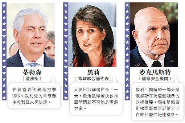 虽然三名美国高管均对叙利亚问题表达了高度关心,但看似不异的言论却现含冲突:麦克马斯特侧沉于要求俄罗斯改变正在叙方案;蒂勒森强调美国的首要是冲击伊斯兰国(ISIS),巴沙尔的去留将由叙人平易近决定;而黑莉则认为罢黜巴沙尔是美优先选项。