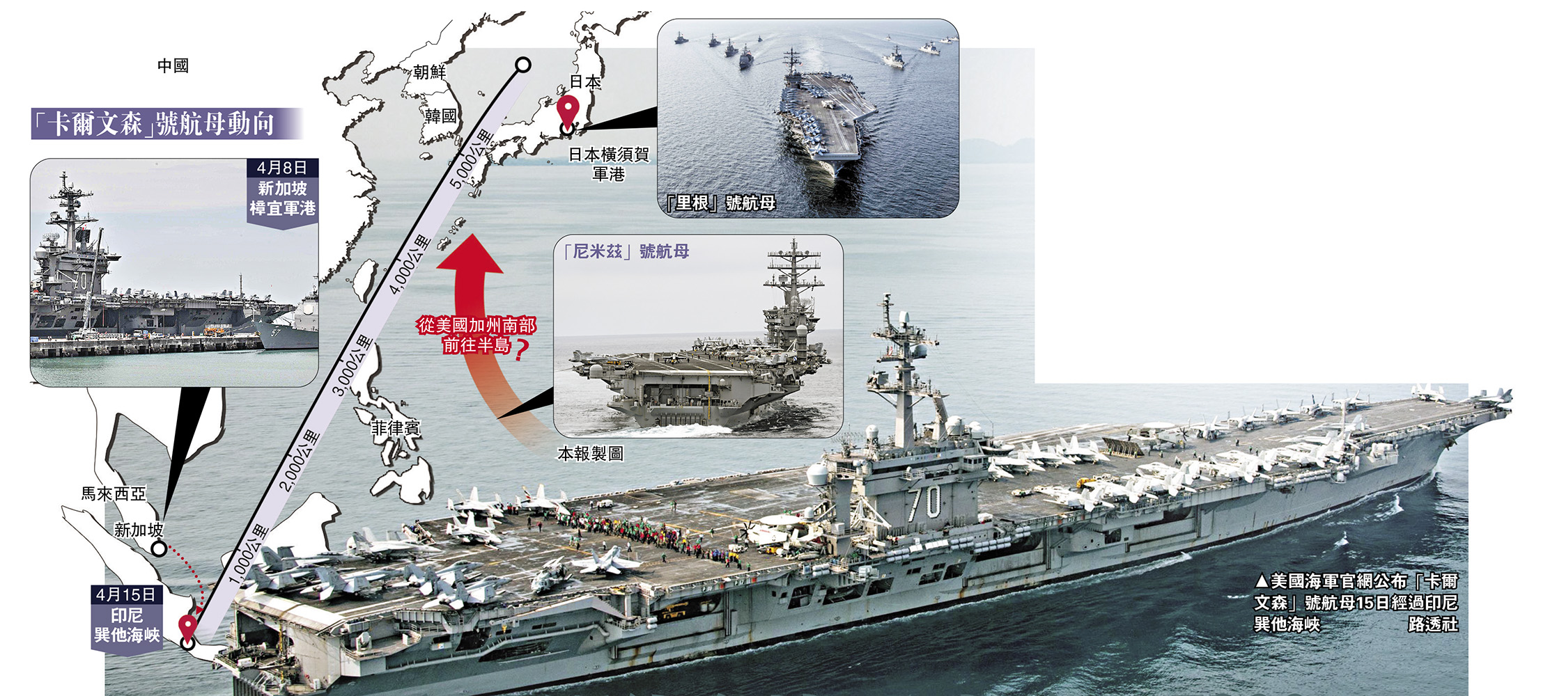 到了15日,朝鲜大阅兵大秀新型导弹,16日又再试射了北极星-2型潜射导弹,但卡尔文森号照旧未正在半岛附近露面,惹起猜测。韩联社17日还征引韩国动静称,卡尔文森号和役群将于4月25日,即朝鲜建军85周年留念日当天抵达半岛附近水域,取韩军举行结合演习。除了卡尔文森号,停靠正在日本横须贺的美国航母里根号,以及停驻的美国航母尼米兹号将于月底云集半岛。