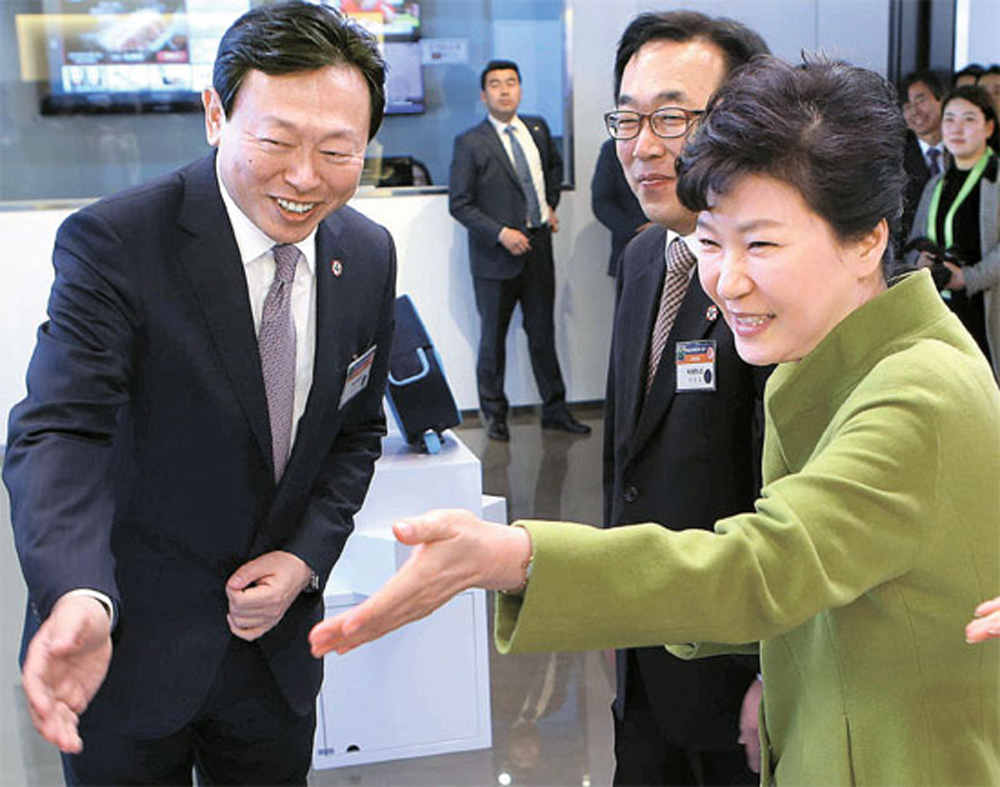 图:朴槿惠(左)取辛东彬(左)2015年3月出席釜山创制经济立异核心落成典礼/网上图片