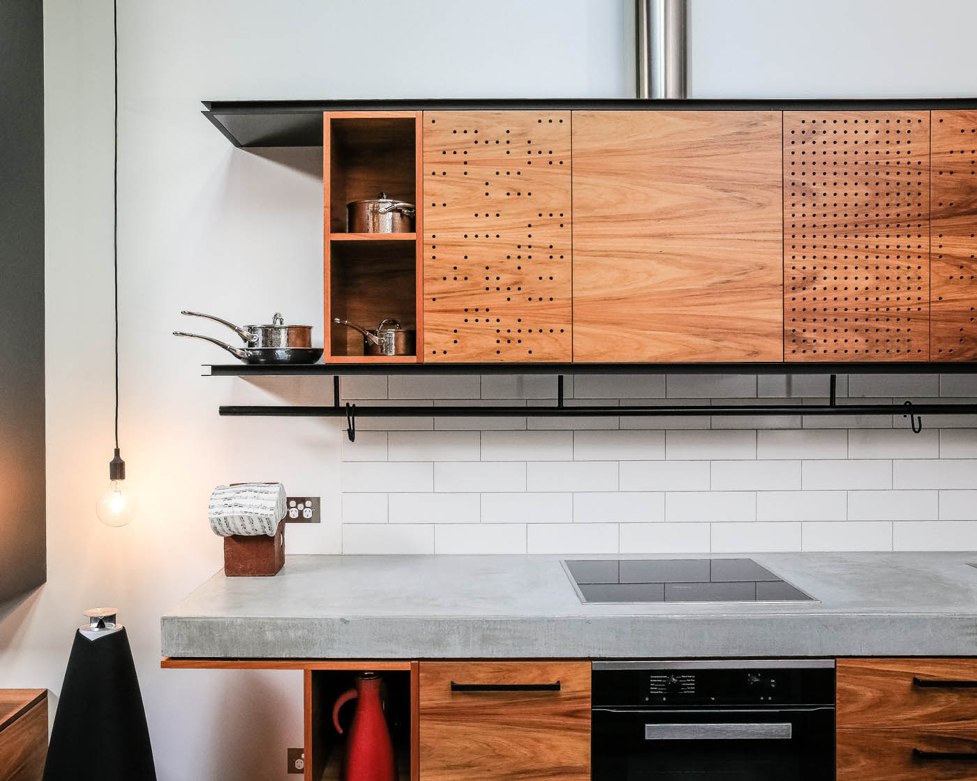 客堂旁边是厨房,设有一个混凝土台面,取木柜和黑色的硬件搭配。厨柜是用冲孔木板制成的,用来做为艺术。正在厨房墙壁的对面,有一个大型厨房岛,拆有混凝土吊坠,可同时容纳四人用餐。正在厨房岛和客堂的后面,是一面砖墙,设想师并没有过多的,易让人想起旧日被用做贸易车库的光阴。