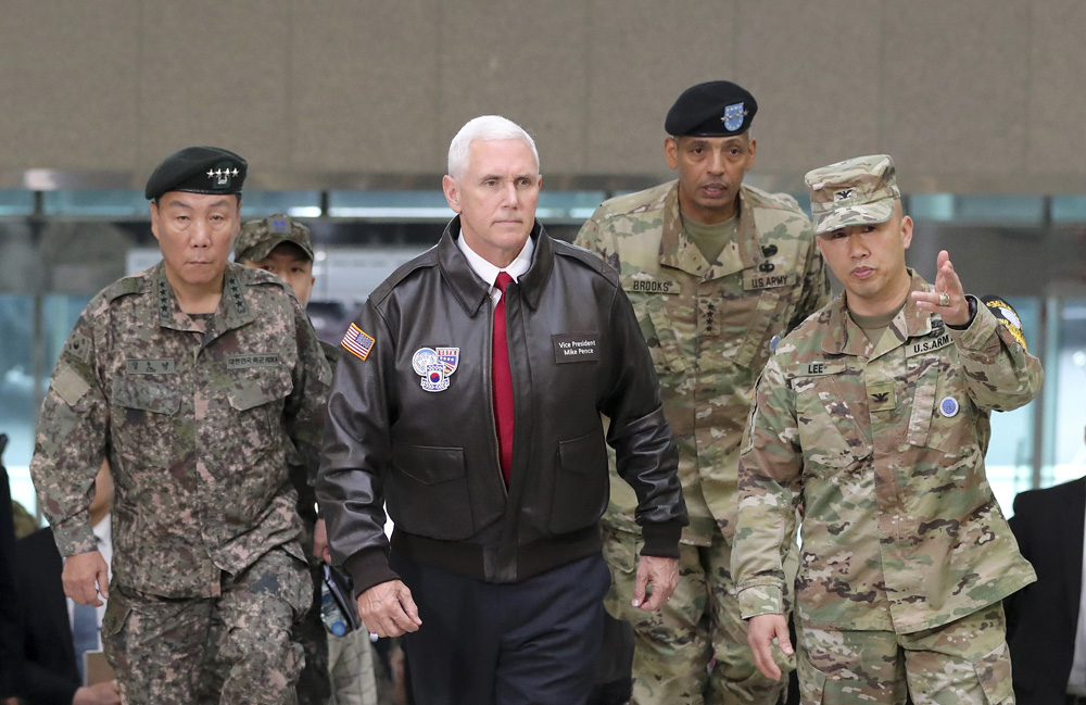 图:美国副总统彭斯(左二)4月17日到访板门店/