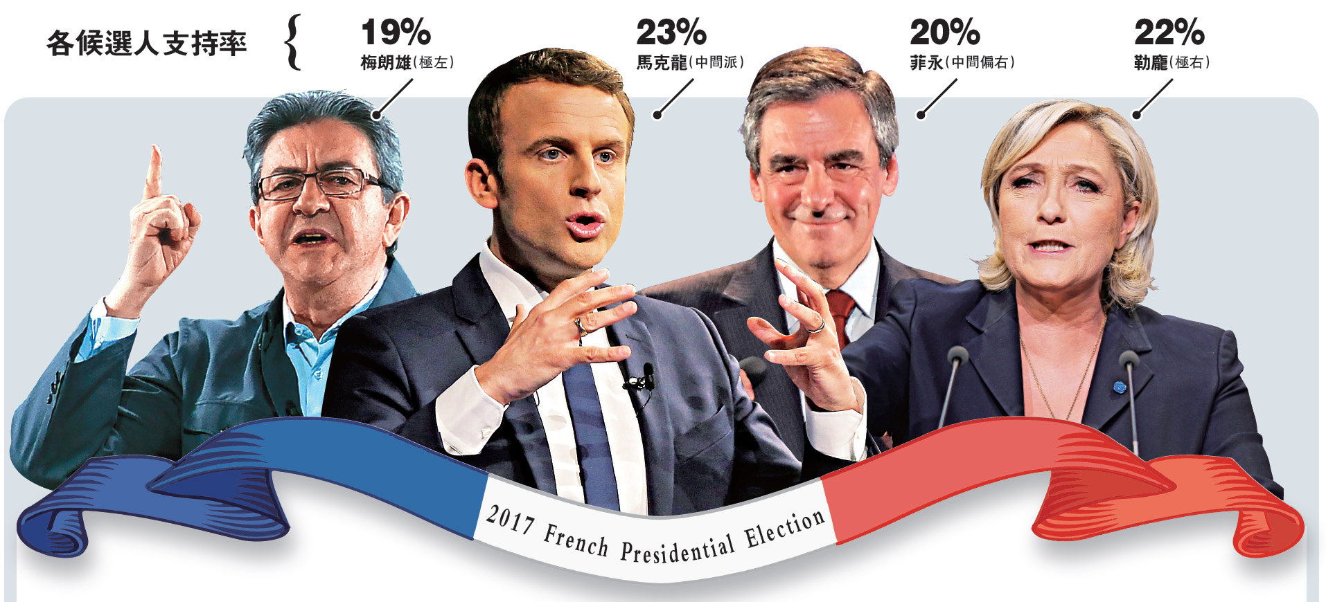 按照多个平易近调,同样支撑欧盟的菲永和马克龙,取疑欧派的极左候选人勒庞及极左激进派梅朗雄,构成四人等分全国的场合排场,正在支撑率不同不多的下,本次曾经成为法国数十年来最难预测的一场大戏。