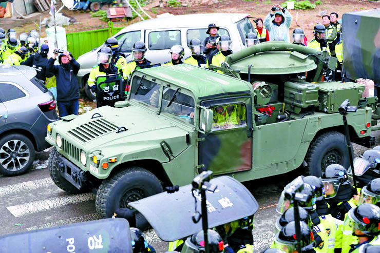 图:驻韩美军的军用卡车26日将萨德部件运往目标地