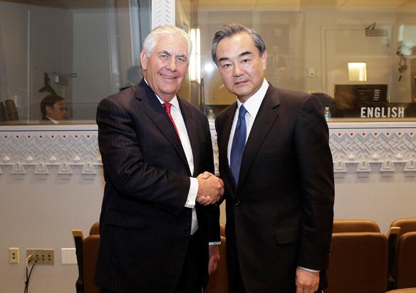 图:王毅正在纽约会见了美国国务卿蒂勒森 中新社