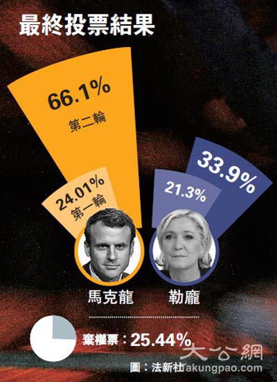 法国内政部正在8日发布,马克龙以66%的得票率压服性打败勒庞(得票率34%),创制新的法国汗青。据悉,他是法国第五国汗青上最年轻国度元首,也是逾半世纪以来第一位来自非支流政党的总统。