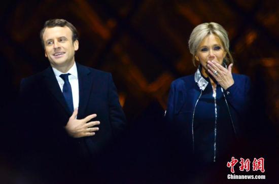 马克龙和老婆布丽吉特正在巴黎卢浮宫前举行的庆贺胜选会议上。 中新社记者 龙剑武 摄