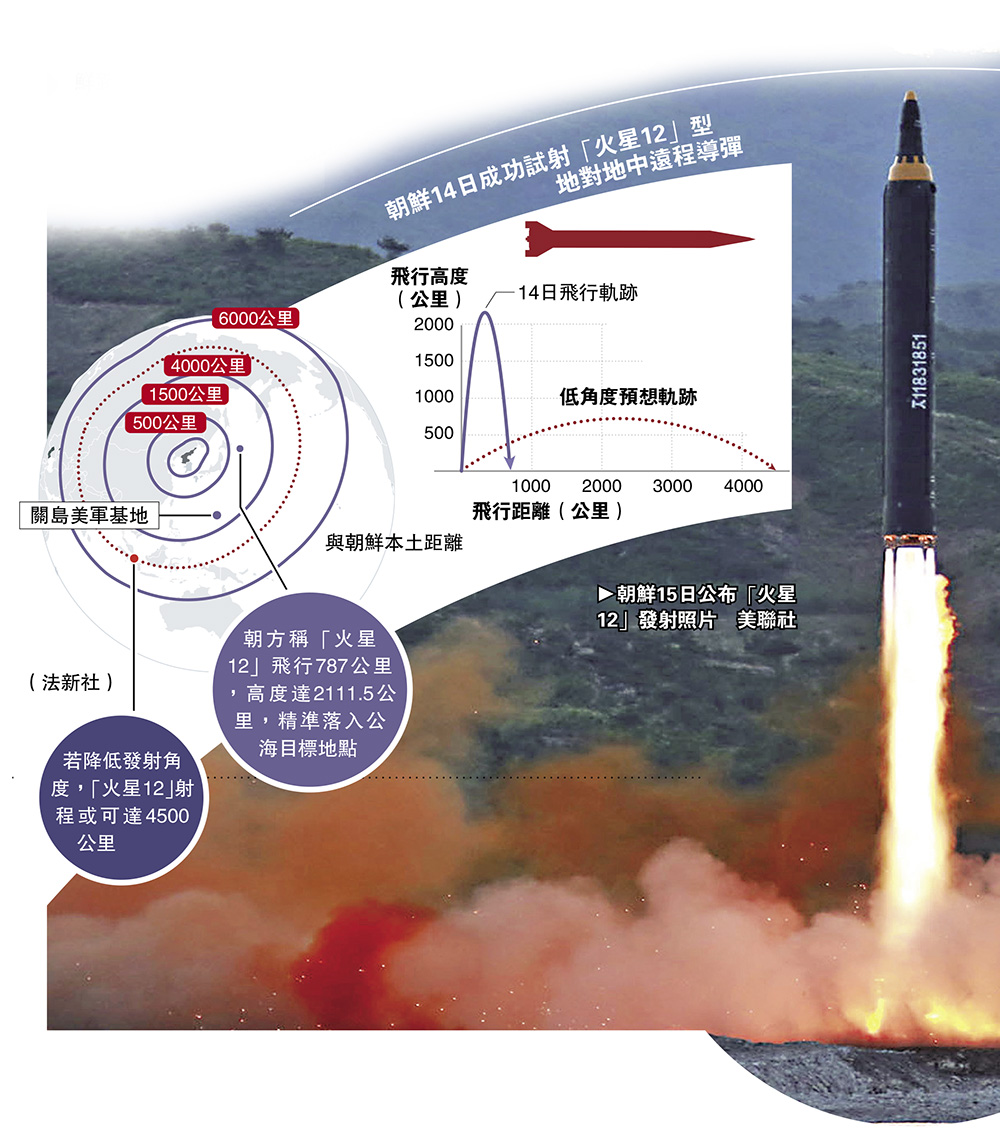 火星12採取非常高的角度发射,专家暗示,若是按照尺度轨迹,它的最远射程将可达4500公里,如许的里程能轻松冲击到日本和韩国,不外还无法冲击到美国本土。