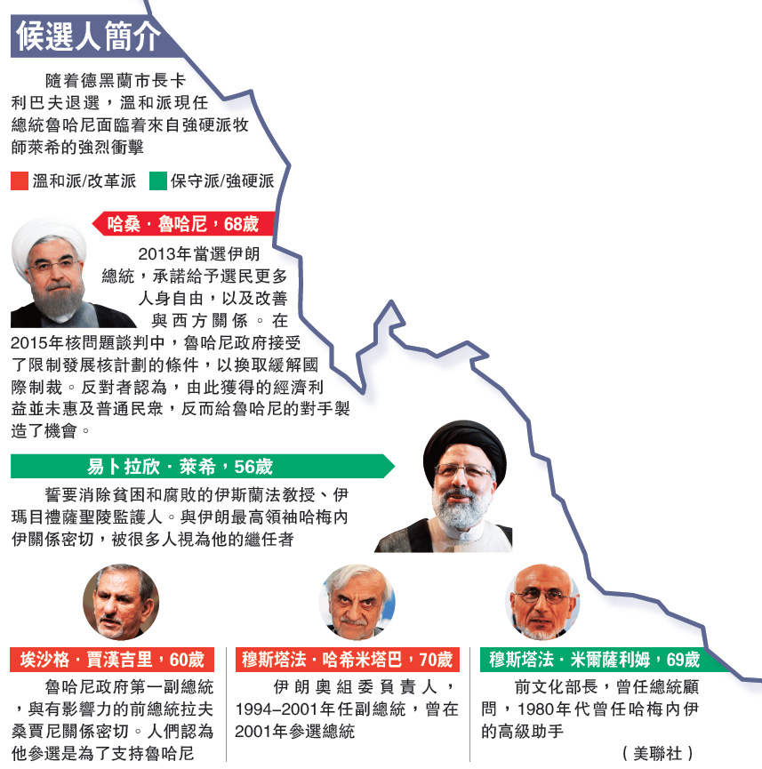 伊朗总统将于5月19日进行,获逾对折选票的候选人将间接被选,不然得票前两位的候选人将进入5月26日的第二轮比赛。