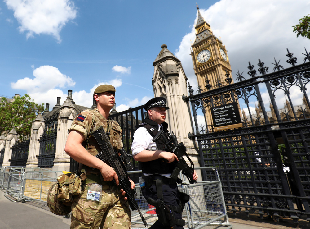 图:英国甲士24日取军拆差人正在议会大楼外巡查 透社