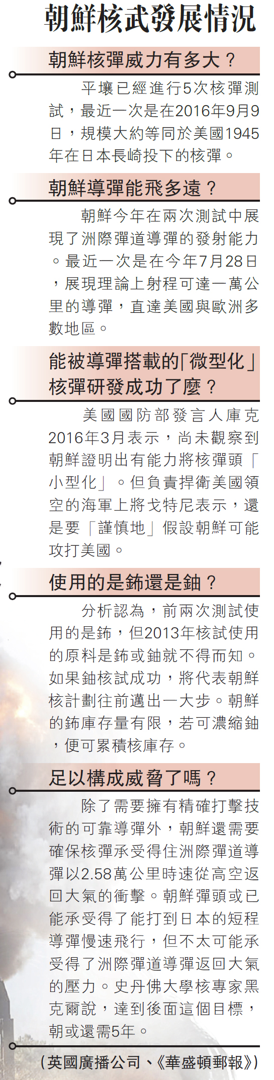 【大公报讯】据彭博社、CNN报道:美国总统特朗普8日对朝鲜抛空前狠话,称若再美国,恐遭前所未见的烈焰取怒火。美国人士取专家却大泼特朗普冷水,以至称美国该学着取核武朝鲜共处。