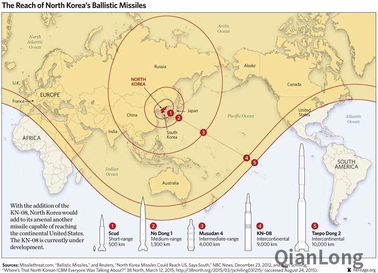 材料图:朝鲜弹道导弹射程范畴示:此中 ①为飞毛腿 ②为芦洞 ③为舞水端 ④为KN-08 ⑤为大浦洞-2。/图片来自千龙网