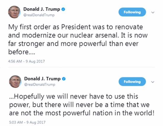 图:美国总统特朗普于美国本地时间8月9日正在推特上持续发送了2条推文,指出美国的核兵器比以往任何时候都强大,并自称美国是世界上最强大的国度。