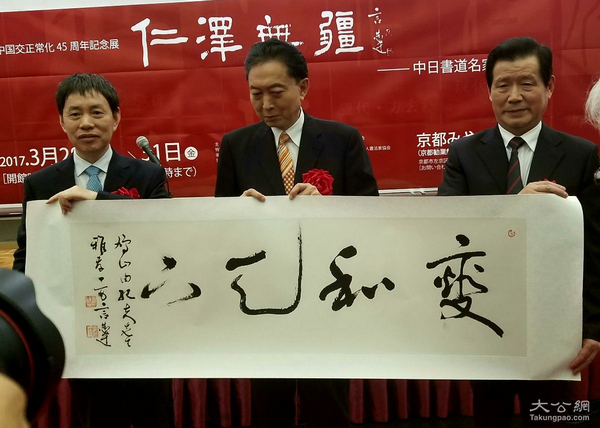 本年4月正在日本举办的书法展商,言恭达先生向日本前辅弼鸠山由纪夫赠送寄意敌对的书法做品(大公报记者杨明奇摄)