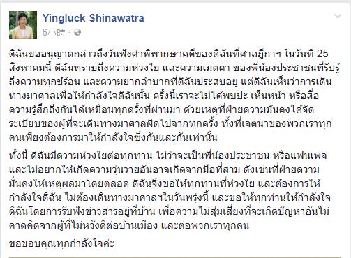 原定于今日宣判的泰国前总理英拉大米渎职案延期,宣判日期改为9月27日,目前泰国最高法院预备对英拉拘系。英禄昨日(24日)正在Facebook撰文,附上本人身穿黑衣的照片。帖文写道:我想所有担忧及支撑我的人士,不要前去法院,应留正在家中,避免他人带来未能意料的麻烦。她同时感激所有支撑者的支撑。