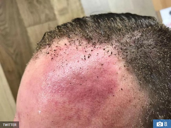 地铁上的一名乘客正在推特上发布了一张他烧焦的头的照片。/图片来自推特