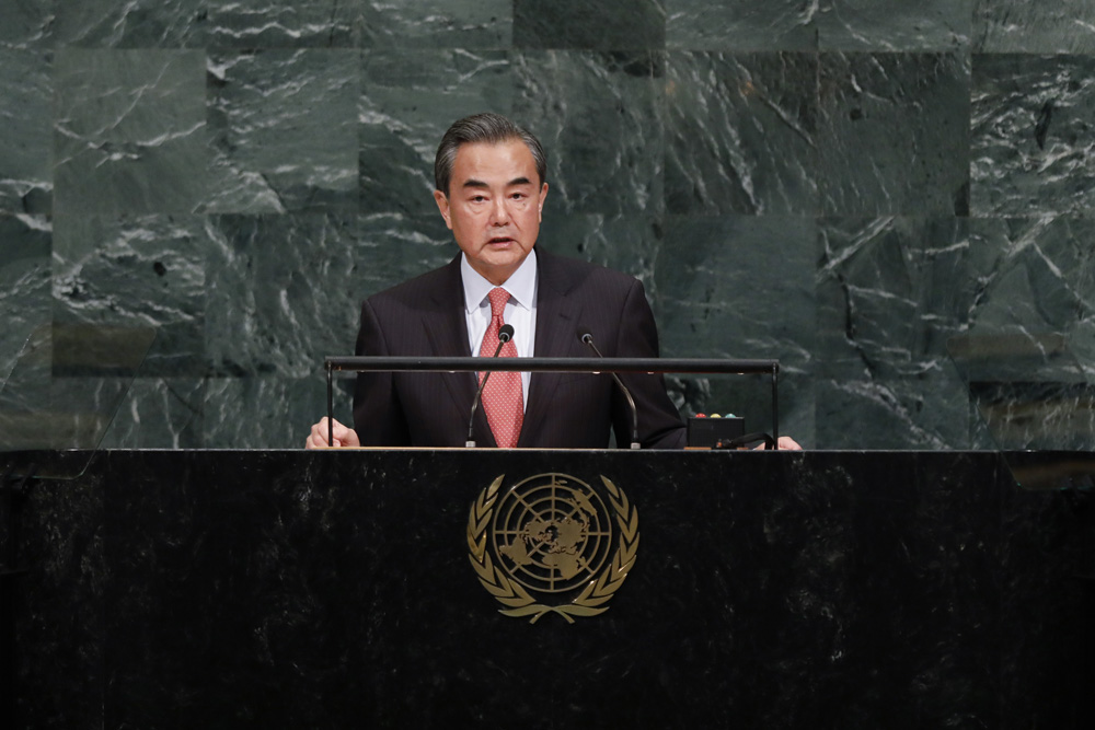 图:交际部长王毅正在第72届结合国大会一般性辩说上讲话/