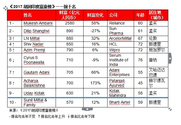 大公网9月26日讯(记者张豪) 胡润研究院9月26日正在上海发布《2017胡润印度富豪榜》(Hurun India Rich List 2017),这是胡润研究院持续第六年发布印度富豪榜,上榜门槛为10亿人平易近币。上榜企业家财富总和高达4万亿人平易近币,相当于印度客岁P的四分之一,接近P,是南非和以色列P之和。136位十亿美金富豪上榜,比客岁添加10人,创汗青新高。前100名门槛比客岁提高12%,是五年前的4倍多,达到84亿人平易近币。胡润百富董事长兼首席调研员胡润暗示:本年印度企业业绩好于预期,抵消了印度废钞令所带来的影响。