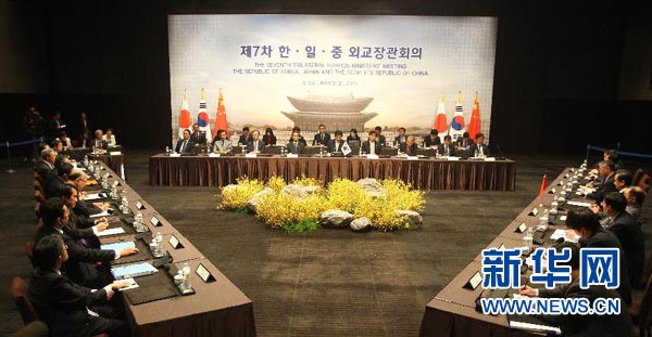 2015年3月21日,正在韩国首尔拍摄的第七次中日韩外长会现场。 图:新华网