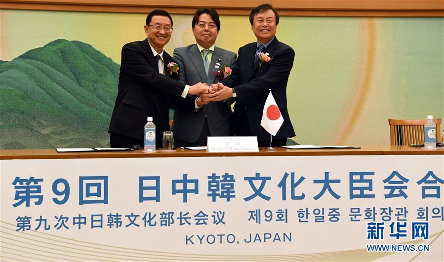 8月26日,正在日本京都,中国文化部部长(左)、日本文部科学大臣林芳正(中)、韩国文化体育参不雅部长官都钟焕合影。第九次中日韩文化部长会议26日正在2017年东亚文化之都日本京都召开。中国文化部部长、日本文部科学大臣林芳正、韩国文化体育参不雅部长官都钟焕出席会议。记者 马平 摄