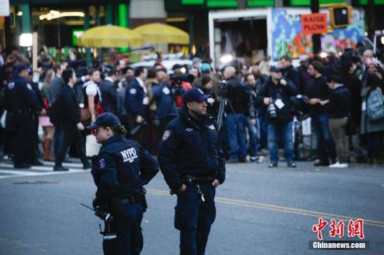 浩繁记者堆积正在纽约曼哈顿西侧快速卡车撞人可骇袭击现场。 中新社记者 廖攀 摄