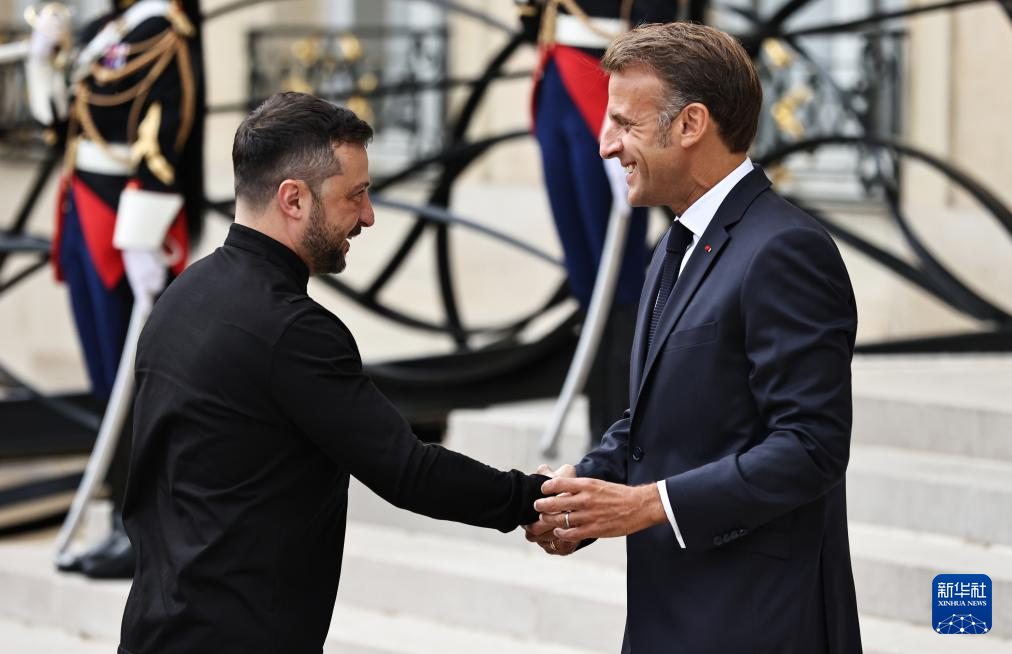 9月4日,在法国首都巴黎的总统府爱丽舍宫,法国总统马克龙(右)迎接出席“志愿联盟”线上会议的乌克兰总统泽连斯基。