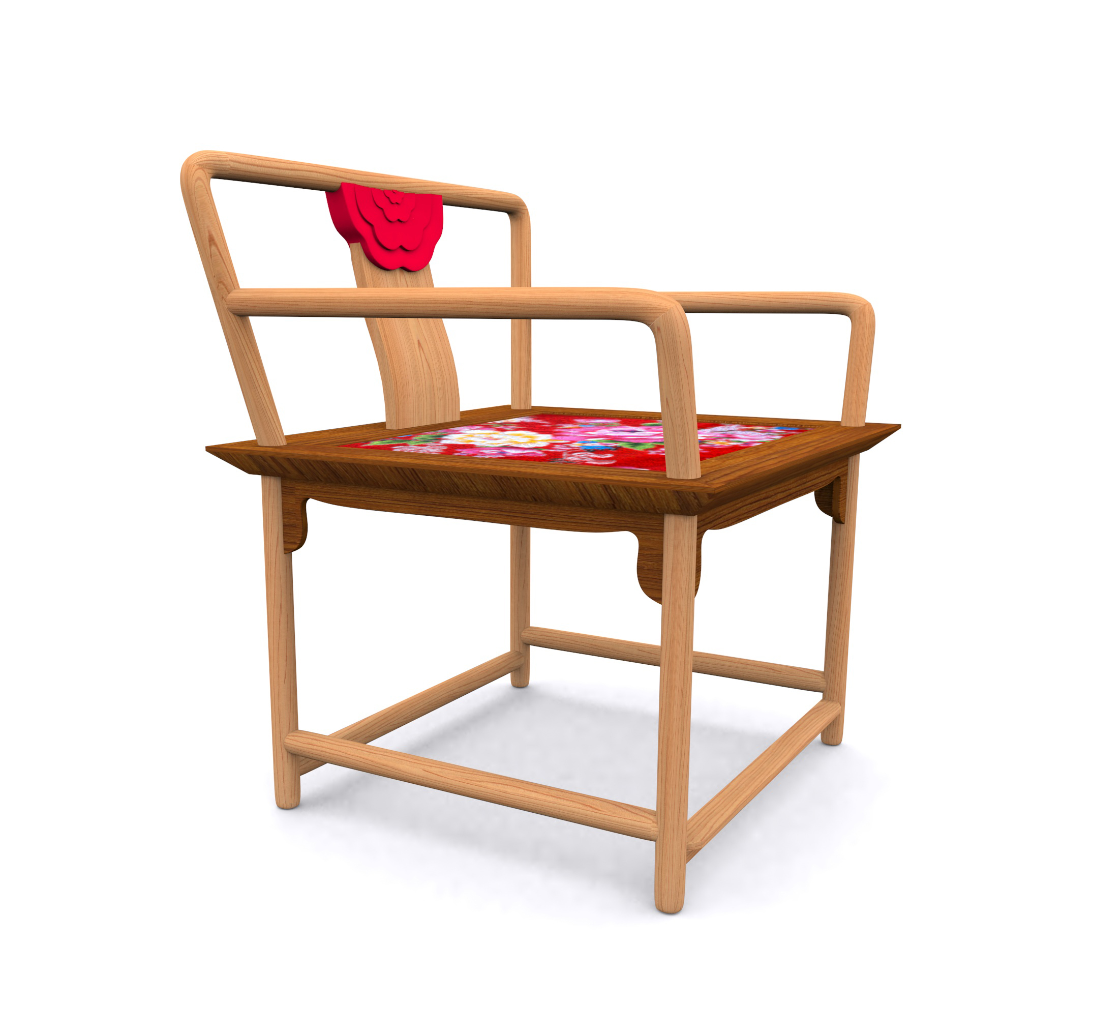本设计结构采用传统木家具的榫卯结构。座板部分木材采用深色的“古夷苏木”,浅色圆柱型的扶手和框架部分的木材采用水曲柳,深浅不同的2种木材搭配在一起显得很生动协调。靠背红色花形部分采用木工刻配于红色大漆涂装,座面“花卉图案”部分采用真皮印染工艺。制作工艺并不复杂,非常适合工厂批量化生产。