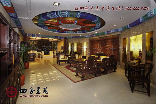 在实景照片中,我想表达红木家具在中式家具界居于显赫尊贵地位的这种感觉,我需要建立观者与展品之间的间隔,因此我选择了台地、汉白玉阑干、假山、藻井等这些基本中式元素来配合,最终这样效果就呈现出来。与其他各种室内空间一样,通过点、线、面、空间的规划勾勒组合出整体的装饰。在这一过程中,展厅洞彻空间优势并始终与装饰主题所要求的设计方案靠拢。