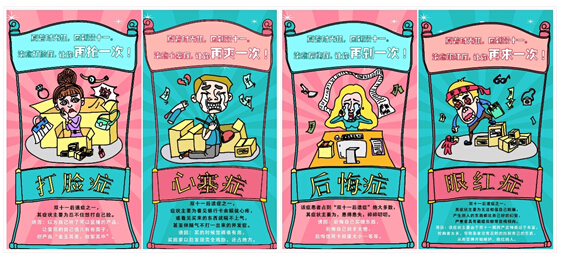 正如海报中所示,“双十一”之后,“下单一时爽”却买了很多鸡肋产品的“心塞症”,还在自豪“八秒成功抢到限量版”却发现促销之后限量版还供货充足的“打脸症”,直呼“买完一下回到解放前”的“后悔症”以及吐槽抱怨“支付太卡,看睁睁看着中意的宝贝失效”,只能看别人收货爽的“眼红症”。还在对快递望眼欲穿的你,有没有中招?其实,具有以上症候群表现的消费者并不算少数,商家也纷纷推出“双十一”返场的促销活动,送给消费者一剂良方。