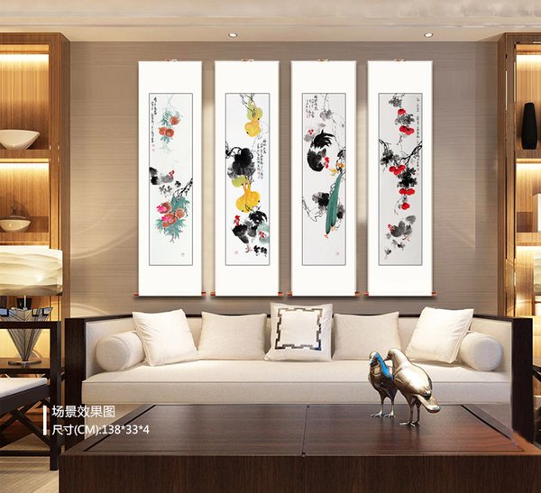 这是一幅瓜果四条屏,右起第一幅是一幅柿子图,右起第二幅是一幅丝瓜图,右起第三幅是一幅葫芦图,最后一幅是笑口常开的石榴图。葫芦被认为是给人类带来福禄、吉祥的灵物,是“福禄吉祥”、“健康长寿”的象证,石榴因其色彩鲜艳、子多饱满,常被用作喜庆水果,象征多子多福、子孙满堂。柿子和公鸡寓意事事如意,大吉大利,而丝瓜也有多子多福、子孙满堂的美好寓意。