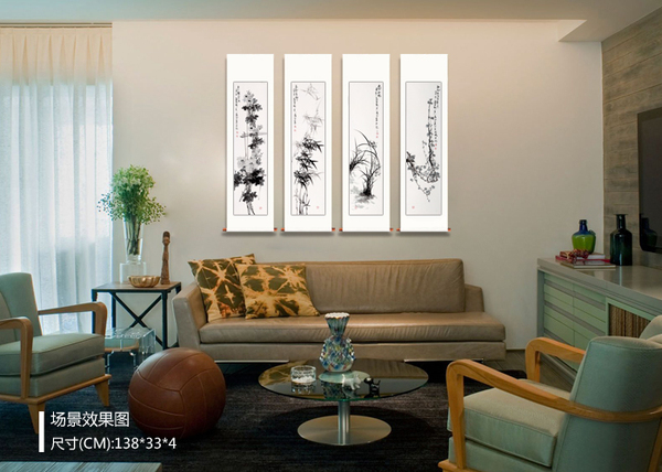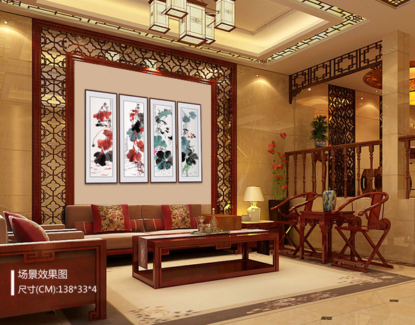 紧张忙碌的工作生活,需要一些调节,家就是大家放松身心、养精蓄锐的地方,沙发背景墙挂画选择就应该以舒适、温馨、和美、如意风格为主,像杨成功荷花图或花鸟画四条屏都是不错的选择,清新淡雅,秀丽脱俗,能给人以极美的身心体验,愉悦身心。