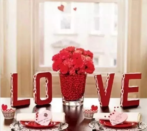LOVE大大的四个字母放置在桌上,这是你们每天想对对方说的话,现在成为无形的表达。蜡烛上面插着心形的卡片大胆直白地表达心意,香薰蜡烛呢喃诉情,红色烛光表达着你们热烈洋溢的爱意。餐盘上放着你们各自的卡片,餐前看看他对你和你对他的甜言蜜语吧!
