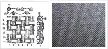 斜纹:经纱和纬纱至少隔两根纱才交织一次。斜纹面料比较好辨认,因为斜纹面料经线和纬线的交织点在织物表面呈现一定角度的斜纹线的结构形式。它的特点是有正反面之分,交织点较少,浮线较长,手感松软,密度较高,产品比较厚实,组织立体感较强。
