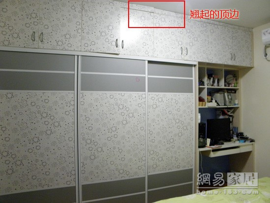 问题呈现正在安拆环节,因为尺定制的衣柜顶部和侧边都有必然的裂缝,需要零丁做顶封板。可是,顶封板毗连做得比力粗拙,胶水踪迹较着,并且顶部用柜面的斑纹封边,就像一块花布做了花腔不流利的裁剪,怎样看怎样别扭。几年后,这个的面板起头翘边,成为了视觉的伤痕。