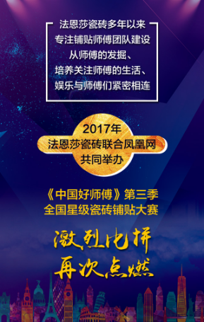 凤凰网也洞察了这一现状,联手法恩莎瓷砖,借帮《中国好师傅》大赛平台,开展铺贴师傅这一类工人的抽象改制大型公益,免费帮帮铺贴师傅进行抽象改制,目标是提拔铺贴师傅甚至工人阶层的社会抽象,展示工人师傅们纷歧样的精力面孔。
