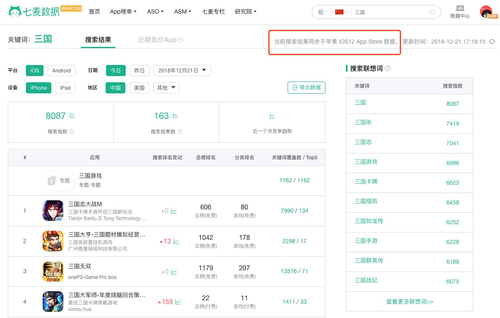今年9月苹果秋季发布会后,iOS12系统正式上线。App Store在12月3日的统计数据显示,已有70%的设备在使用iOS12系统。而iOS12系统下的关键词搜索结果排名、热搜、Today推荐等,均与iOS11及以下版本有着不同程度的展示结果偏差。