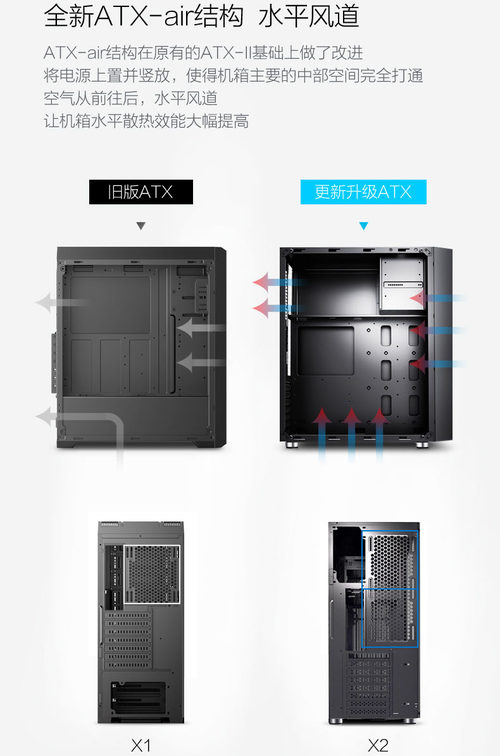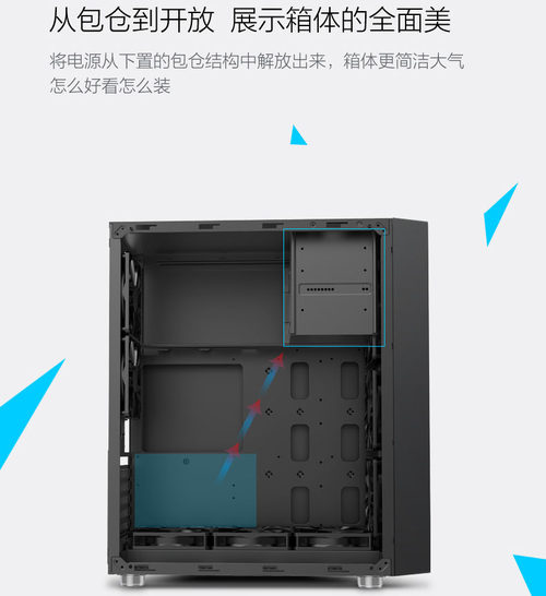 先马涡轮飓风机箱三大亮点中,最具新意的当属提出了ATX-Air架构概念,该架构将机箱原有的固定仓位都全部摒弃,电源改成了前置并竖放,机箱变成了全开放式无包仓的架构。这样,机箱内硬件布局空间利用也就更显充分,对流散热不再有任何阻隔,散热更显流畅、高效,为核心硬件时刻能享受到超快感的散热打下了良好的基础。