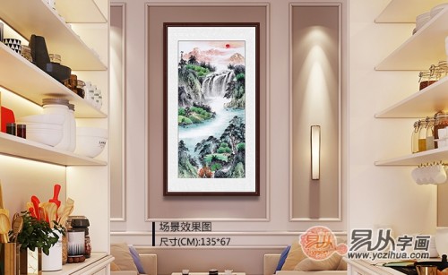 画中飞落的瀑布浩浩荡荡,无比壮丽;山下泉水清澈流淌,溪边翠绿小草繁茂,在溪水的细润下,枝叶更加青葱茂盛。作为走廊挂画,很有艺术风范。