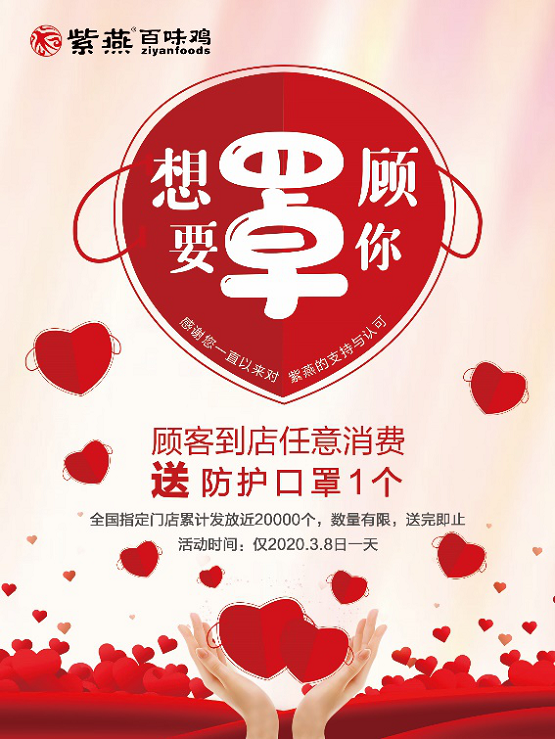 2020年,疫情的爆发让市面上的医用口罩变得越来越紧俏。作为一家具有社会责任感的食品企业,为了解决广大群众“无口罩可戴,无口罩可买”的问题,3月初,紫燕食品就开启了好久不见之“想要罩顾你”公益活动。活动期间,只要在紫燕百味鸡门店消费的顾客,均能免费获得2个医用口罩。此次公益行动,让紫燕食品获得了顾客一致好评。