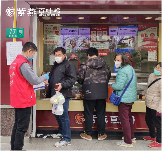 紫燕百味鸡门店从隔离式橱窗售卖、每2小时设备消毒一次、每30分钟洗手消毒、员工每日2次测量体温等实际行动出发来保障售卖安全。