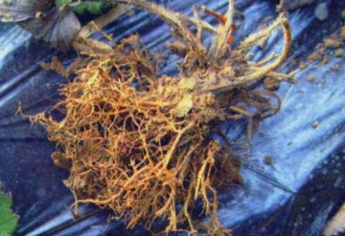 草莓根线虫病由根结线虫危害所致,二龄幼虫从侧根和须根侵入,通过锋利的口针穿刺根部造成机械损伤,传播其它的病害、病菌,与其共同危害加剧病情的发展。此外,根结线虫的分泌物也随之进入根部组织,根组织受刺激后细胞膨大增生,造成侧根和须根上形成许多大小形状不一的瘤状物根结,从而影响其对水分和营养的吸收能力,地上部病株初期症状并不明显或易与其他病害、肥害、缺素症相混淆,但随着病情的发展病株逐渐出现生长衰退、叶片萎蔫或逐渐黄枯,植株矮小,结果少且果实偏小。