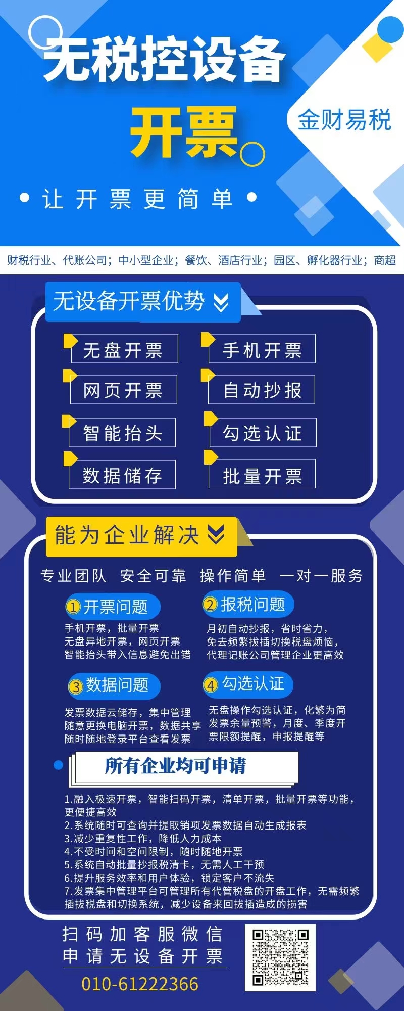目前新上线的无设备开票就可以解决绝大部分人群需求,首先开票时,不需要再插入税控设备或者UK设备,也不需要下载安装任何开票软件,只需打开网页,通过税号登陆即可进入开票系统进行开具发票,如果没有电脑的也可以通过手机进行开票和报税,发票数据,用户信息,商品信息都可以进行云存储,即使设备丢失、损坏,电脑系统损坏了,开票数据也不会丢失。并且还开放了免费的功能提供企业来使用。