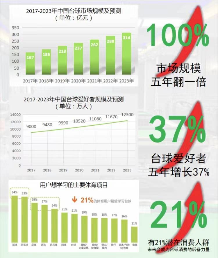 从专业的数据咨询平台“艾瑞咨询”和“观研天下”可以清晰的看到:自2017年以来,中国台球市场规模的增长率,达到了惊人的37%,翻了整整一倍,而在“用户想学习的主要体育项目”一栏中,也可以看到台球项目超过了健身和电竞,成为潜在消费人群最多的体育项目之一,足以见大众对台球运动的喜爱之情。