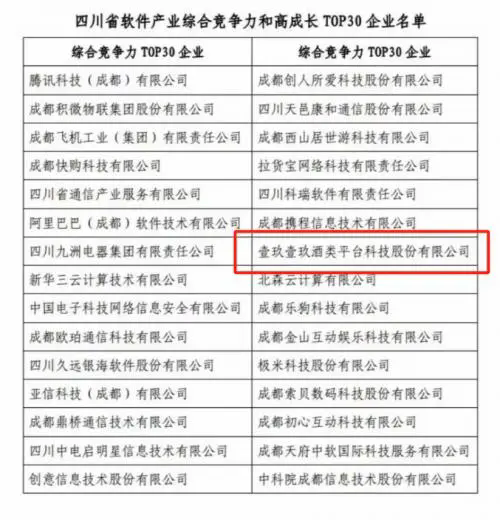 2024年1月,壹玖壹玖酒类平台科技股份有限公司上榜“2023年四川省软件和信息技术服务业综合竞争力企业TOP30”。在众多互联网、通信企业中,壹玖壹玖作为酒类企业代表赫然在列,足见其在信息数字化领域的卓越成就。壹玖壹玖集团有限公司董事长杨陵江曾透露,近年来公司在信息数字化建设上的投入超6亿元。