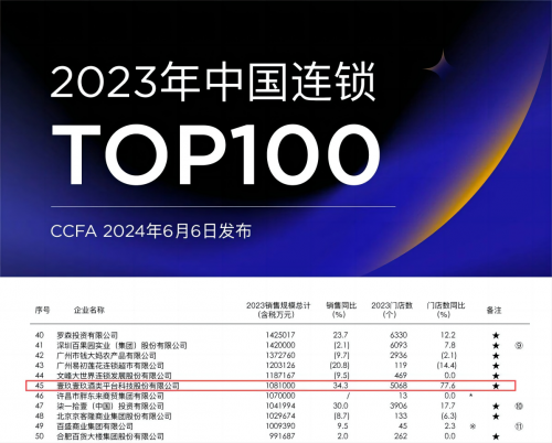 2024年6月,中国连锁经营协会“2023年中国连锁TOP100”榜单公布。壹玖壹玖荣登“2023年中国连锁TOP100榜单”第45位,成为唯一上榜的酒类企业。榜单中有13家企业实现销售额、门店数“双位数增长”,壹玖壹玖便是其中之一。