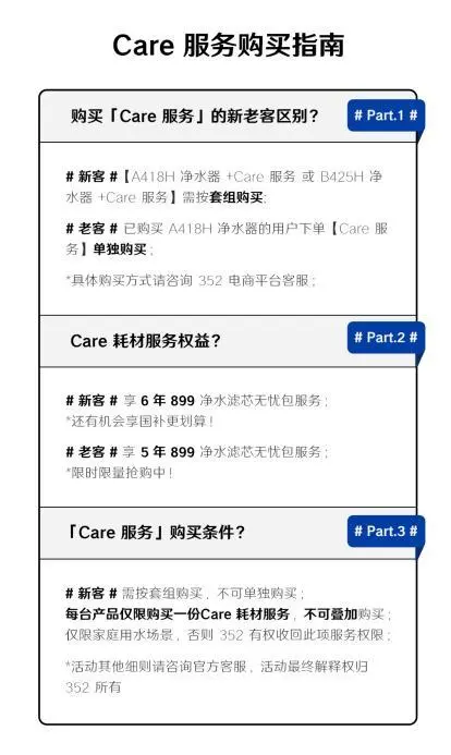 面对行业积弊,352净水器于2024年投下“深水炸弹”:推出行业首个「Care耗材服务」,并在2025年升级面向多型号用户。