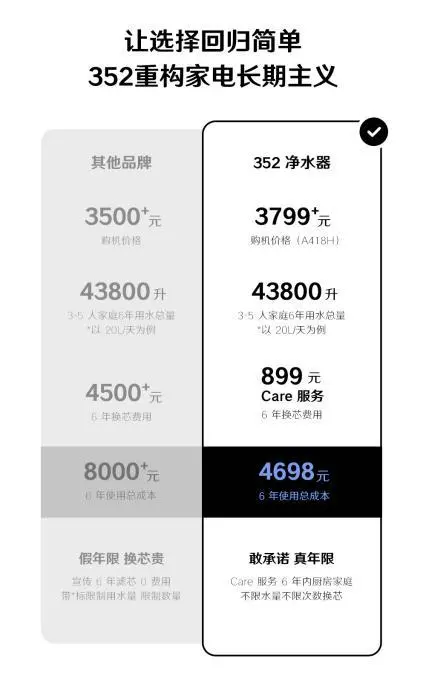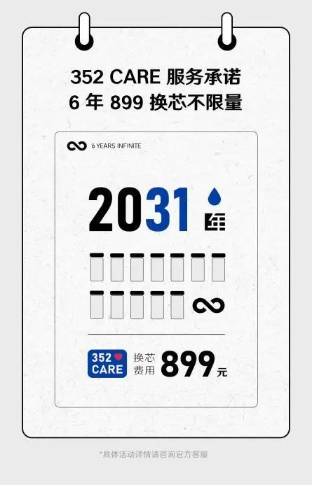 4.更关键的是,352同样关心着老客,老客照样可购买此服务5年899元,不限制目前机器的使用情况及滤芯寿命,购买即可享受换芯服务,可谓是长情品牌;